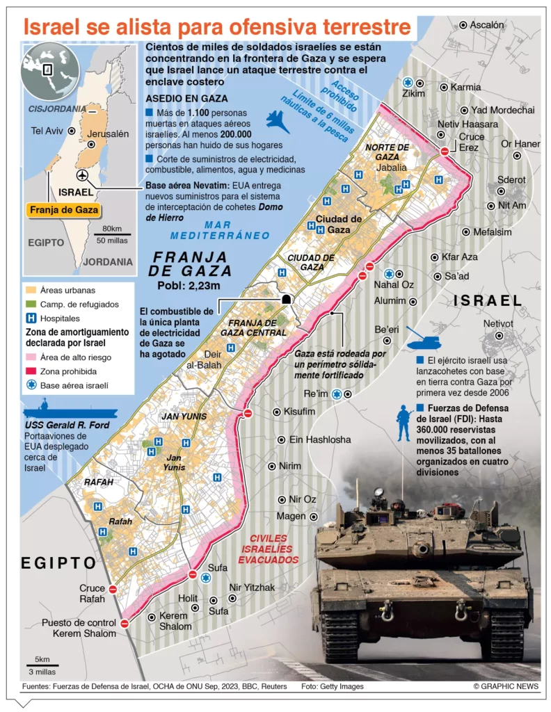 Jerusalén.-El rastro de la masacre de Hamás en el sur de Israel todavía tiene conmocionada a la nación, donde los muertos israelíes superan los 1.200, más que en toda la Segunda Intifada (2000-05); mientras la Franja de Gaza, destruida, sin electricidad ni apenas alimentos, está al borde del abismo con los hospitales colapsados.