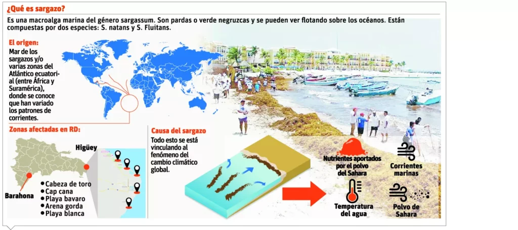 Estas algas llegan de las aguas del Atlántico ecuatorial y arropan las zonas costeras del país y de la región, imposibilitando que los miles de turistas que cruzan los océanos para disfrutar del sol y las cálidas aguas del mar Caribe puedan disfrutarlas.