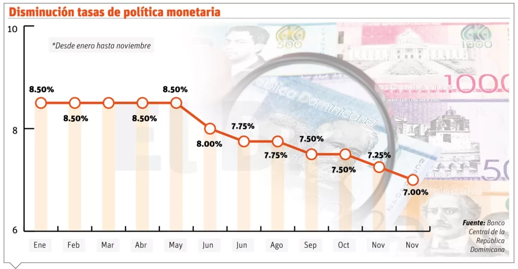 Santo Domingo .-El Banco Central de la República Dominicana (BCRD) decidió reducir su tasa de interés de política monetaria (TPM) en 25 puntos básicos, disminuyendo de 7.25 % a 7.00 % anual.