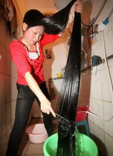 Además de eso Cen dedica gran parte de su tiempo a cuidar de él. Lo lava cada 4 días y para mantenerlo negro, liso y brillante, Cen lo enjuaga con cerveza. las mujeres de una tribu de Huangluo Yao Village en China, dejan su cabello largo y solo se lo cortan una vez en su vida