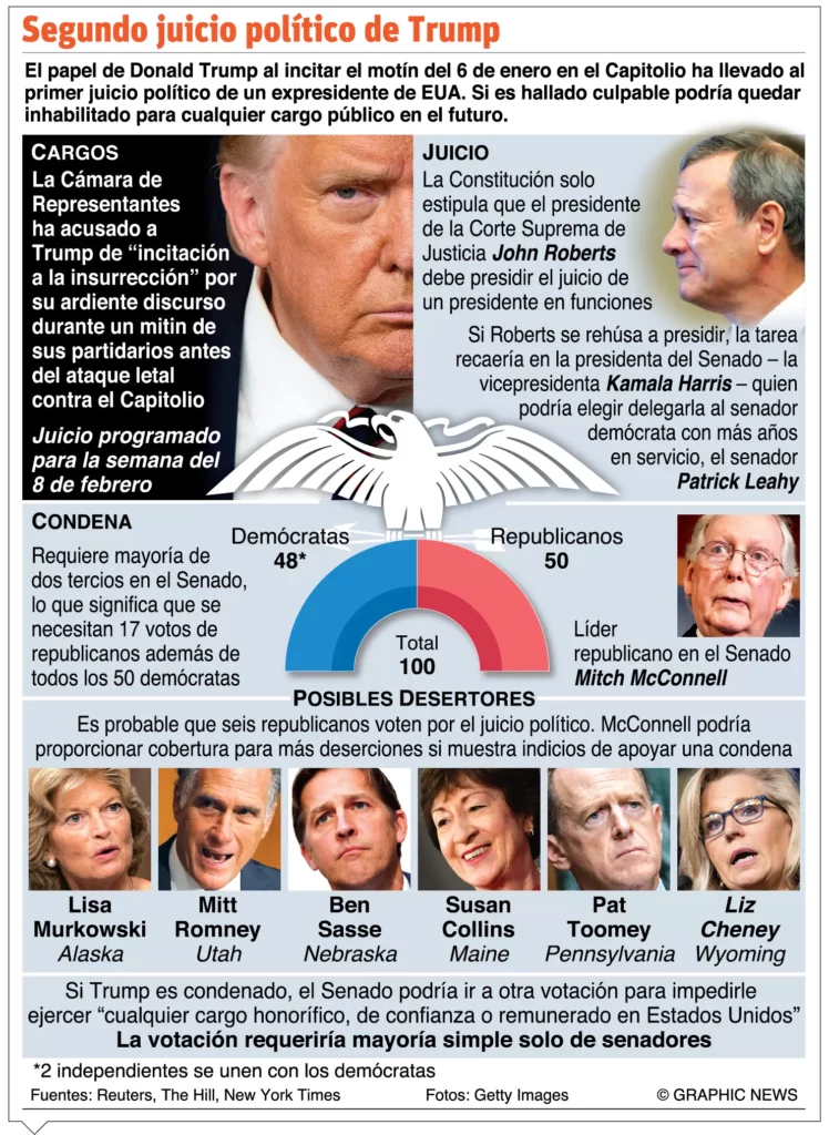 Aunque el proceso no podrá resultar ya en la destitución de Trump, que abandonó la Casa Blanca el pasado 20 de enero, los demócratas confían en que desemboque en la inhabilitación del expresidente para ocupar futuros cargos políticos.