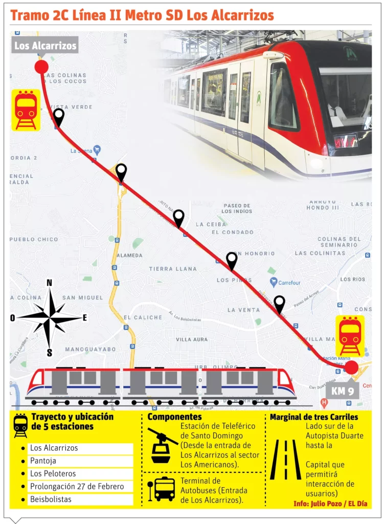 El nuevo tramo 2C de la Línea II Metro de Santo Domingo a Los Alcarrizos contará con cinco estaciones, entre las que figuran sector Pantoja, Los Peloteros, Prolongación 27 de Febrero, y Los Beisbolistas.