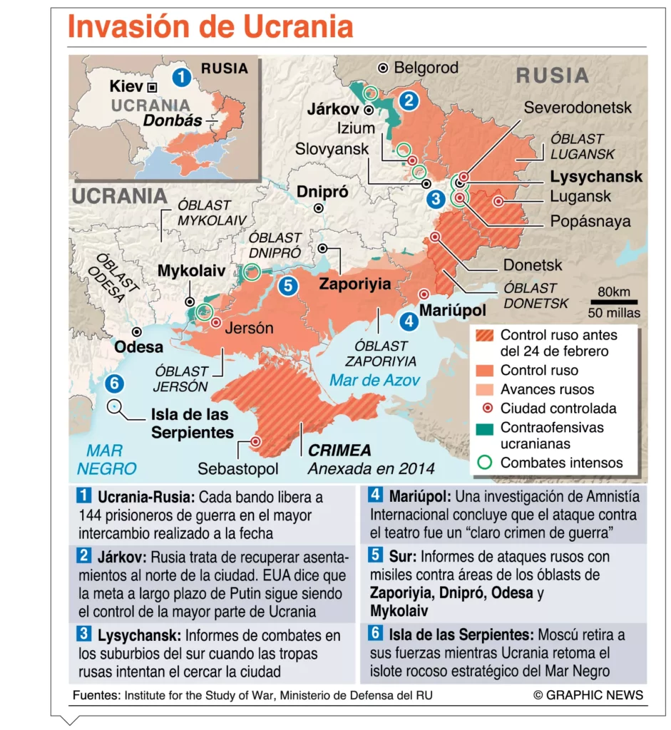 En tanto, el primer buque mercante en salir del puerto ucraniano de Berdiansk, actualmente controlado por el Ejército ruso, abandonó ayer la terminal marítima con una carga de 7.000 toneladas de grano, según informaron la autoridades locales.