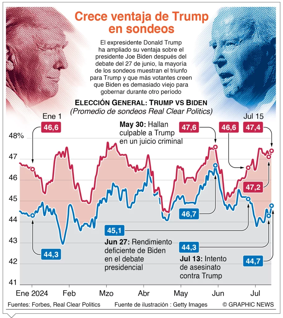 Las encuestas dan la victoria en las elecciones a la Casa Blanca de noviembre a Donald Trump, que se impondría en todos los estados clave. Afecta a Biden el triste papel durante el debate presidencial de junio.