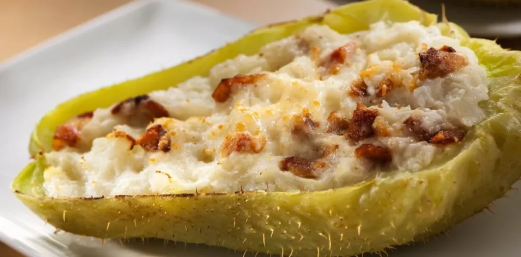 Cocinar las tayotas por la mitad con el caldo de pollo donde cocinamos las pechugas, por 15 minutos o hasta que estén suaves, pero firmes. Escurrir y retirar la pulpa. Reservar.