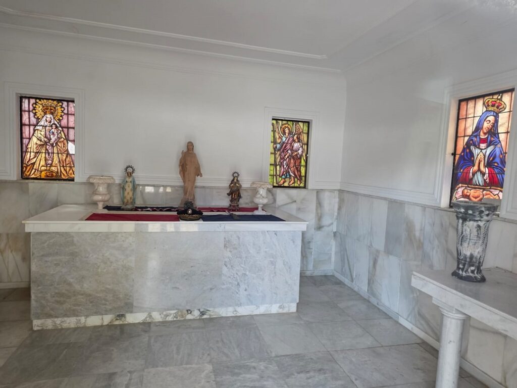 Tras la puerta metálica, el interior del mausoleo sorprende por su austeridad religiosa. Una pequeña capilla revestida en mármol blanco alberga un altar sencillo. Sobre él reposan imágenes religiosas: figuras de la Virgen, de Cristo, de santos, colocadas con cuidado, como si se tratara de un espacio de oración íntima más que de una tumba asociada a uno de los regímenes más represivos y sangrientos en la historia del Caribe.