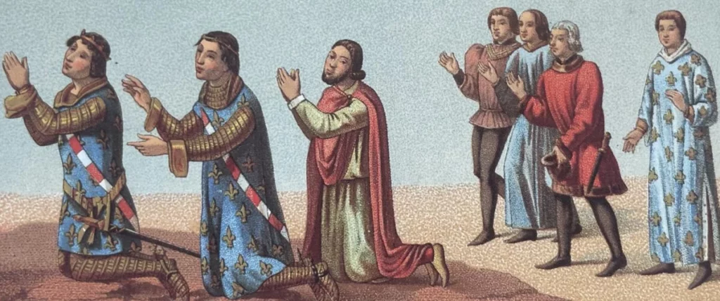 De acuerdo a Mathieu Coussy, escribano de la época, como vestimenta usaban ‘boquetons’ sin mangas, de color bermellón, rojo y verde, adornados con oro y penachos de colores a tono.