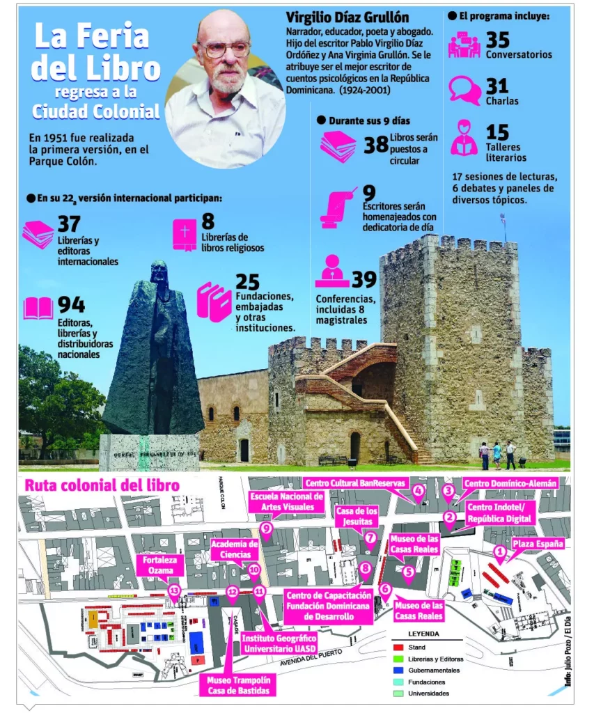 En el Colegio de Artistas Plásticos operará el Espacio Joven, y en la Escuela de Artes Visuales, en la calle El Conde con Isabel La Católica, funcionará la Sala de Talleres Literarios, así como una de exposiciones. “Será montada en el Centro Cultural BanReservas la exposición Virgilio Díaz Grullón, uno de los narradores más destacados en mostrar la psicología del dominicano en la ciudad, a quien se dedica la Feria.