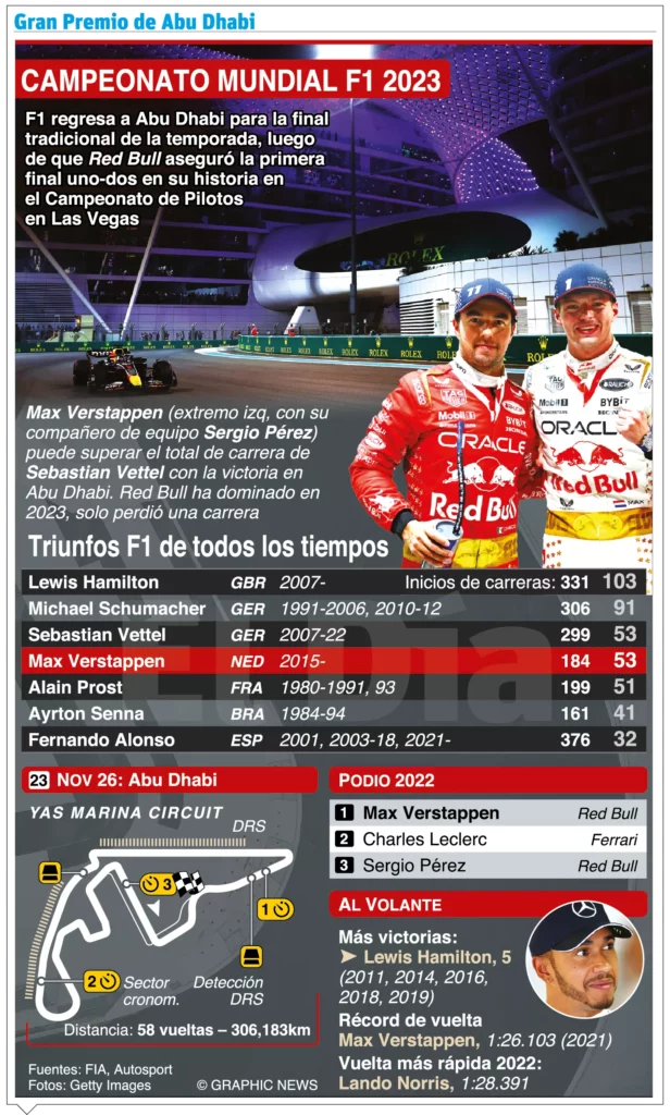 Abu Dhabi.-Tras una gran temporada de Fórmula 1, donde se ha podido ver de todo: buenas carreras, regresos al podio, adelantamientos históricos, pilotos rompiendo récords y el dominio de un piloto en particular; la categoría cerrará su telón en el que ya es su habitual último Gran Premio en el circuito de Yas Marina.
