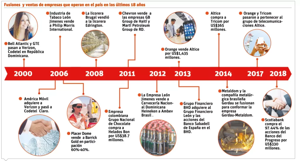 A la lista se añade la Cervecería Nacional Dominicana, la cual pasó al consorcio brasileño Ambev; Orange y Tricom fueron cedidas a la empresa Altice; Metaldom se fusionó con la brasileña Gerdau y crearon a Gerdau-Metaldom, y la más reciente fusión fue del Banco del Progreso con el Scotiabank ,de Canadá.