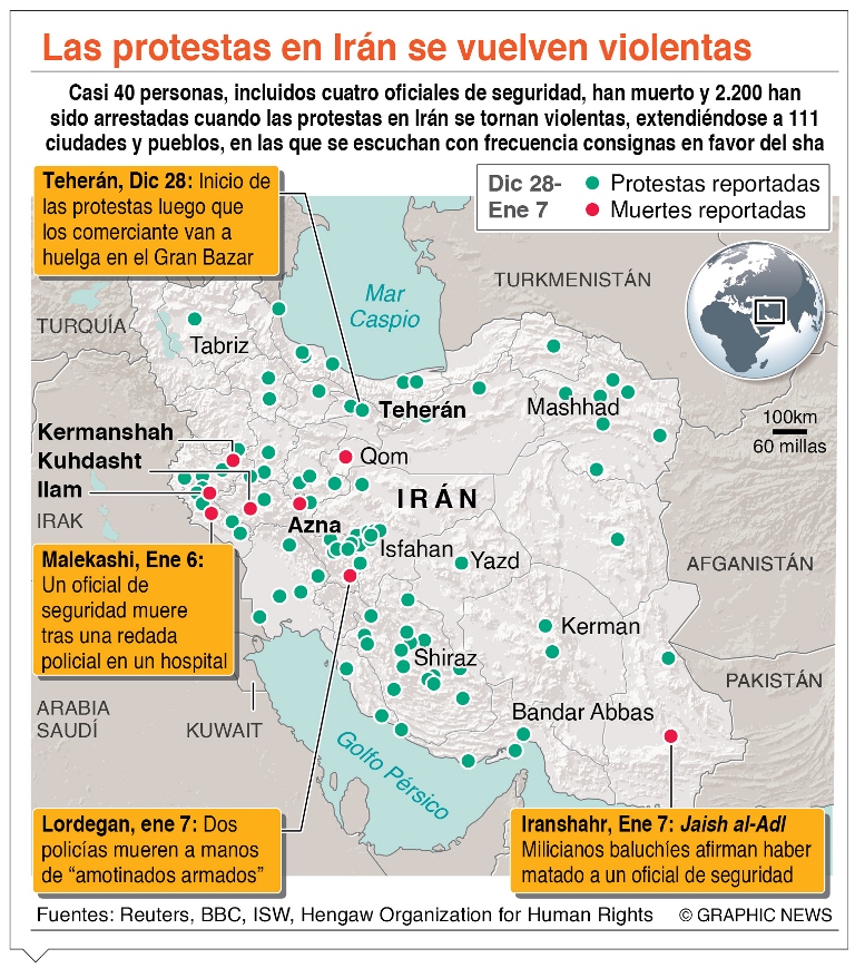 Teherán.-Las protestas continuaron expandiéndose en Irán en su undécima jornada con unas movilizaciones que han alcanzado las 31 provincias del país y a las que se han unido varias universidades, mientras el número de muertos alcanzó los 38.