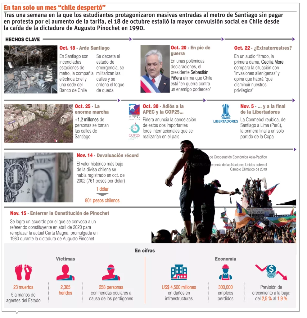 Los desmanes no han frenado las protestas que se suceden casi a diario ni los anuncios del presidente centroderechista Sebastián Piñera, que ha ofrecido leves mejoras sociales y un histórico acuerdo de todos los partidos políticos –excepto los comunistas– para convocar en abril próximo a un plebiscito que preguntará a los chilenos si quieren una nueva Constitución y quiénes tendrían que escribirla.