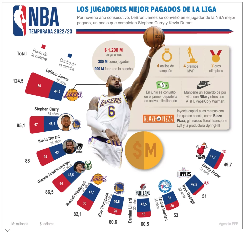 Con unos ingresos antes de impuestos de 124,5 millones de dólares procedentes de su salario en la cancha en 2022-23, más el dinero anual fuera de ella procedente de avales, derechos de licencia y otros negocios, James se convierte en el jugador de la NBA mejor pagado, superando los 121,2 millones de dólares que se calcula que ganó en los doce meses que terminaron en mayo.