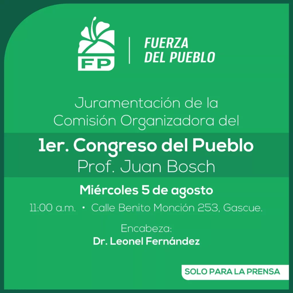 Santo Domingo.- El presidente de la Fuerza del Pueblo (FP), Leonel Fernández, juramentará este miércoles a los miembros del Comité Nacional Organizador del Congreso profesor Juan Bosch, el primero que celebra la organización política creada en octubre del pasado año.