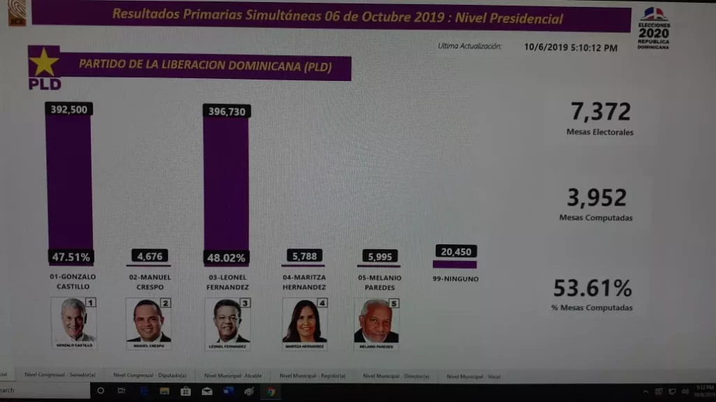 SANTO DOMINGO.- El expresidente Leonel Fernández ya aventaja al precandidato presidencial del Partido de la Liberación Dominicana (PLD) Gonzalo Castillo con 48%.11 (412,583 votos) frente a 47.43% (406, 797 votos