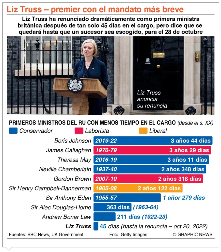 Liz Truss se convirtió ayer en el político que menos tiempo ocupó el puesto de primer ministro en la historia del Reino Unido acechada por la tormenta financiera que desató el agresivo recorte de impuestos.