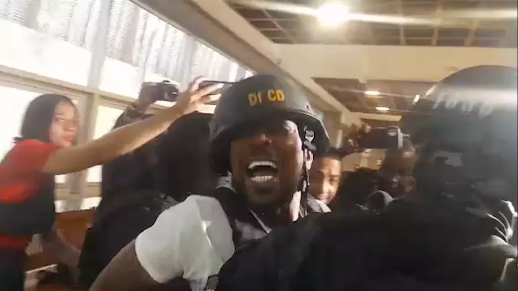 En los pasillos que dan acceso a la sala donde se conoce la extradicción hay apostados nueve agentes de la DNCD fuertemente armados. Además ha sido colocado un aparato de detención de metales.