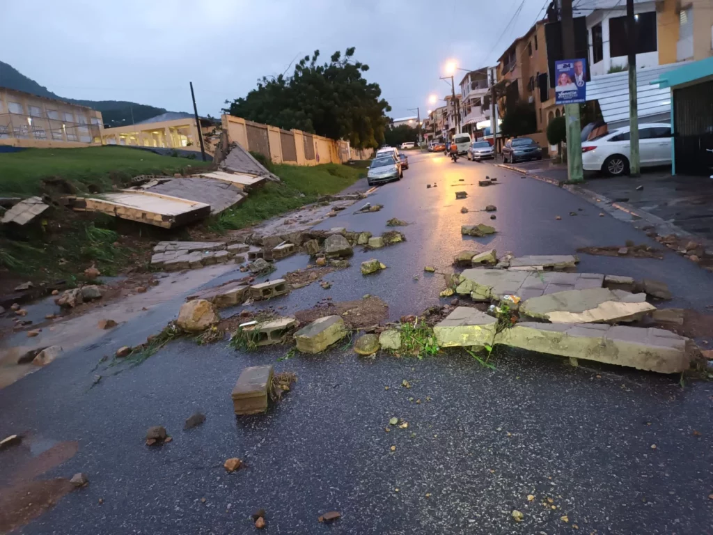 PUERTO PLATA.- Las fuertes lluvias registradas durante las últimas horas han ocasionado inundaciones y el colapso de la verja perimetral de un centro educativo en la ciudad San Felipe de Puerto Plata.