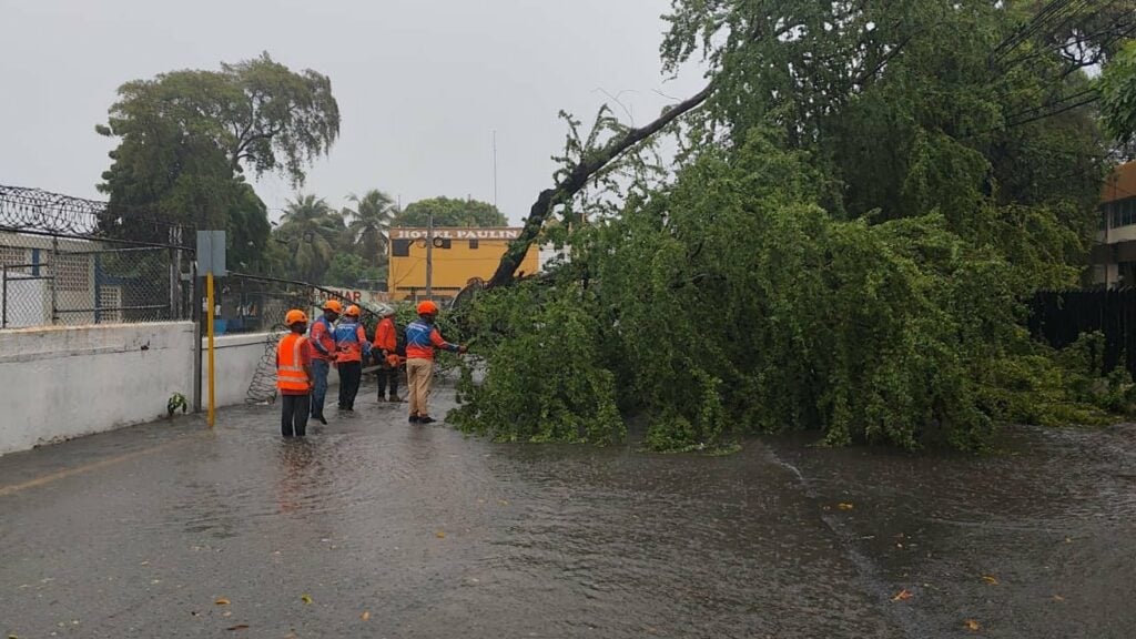 Asimismo, la avenida San Vicente de Paúl permanece anegada frente al Hospital Materno Infantil San Lorenzo de Los Mina, dificultando el acceso al centro hospitalario y afectando el tránsito en ambas direcciones.