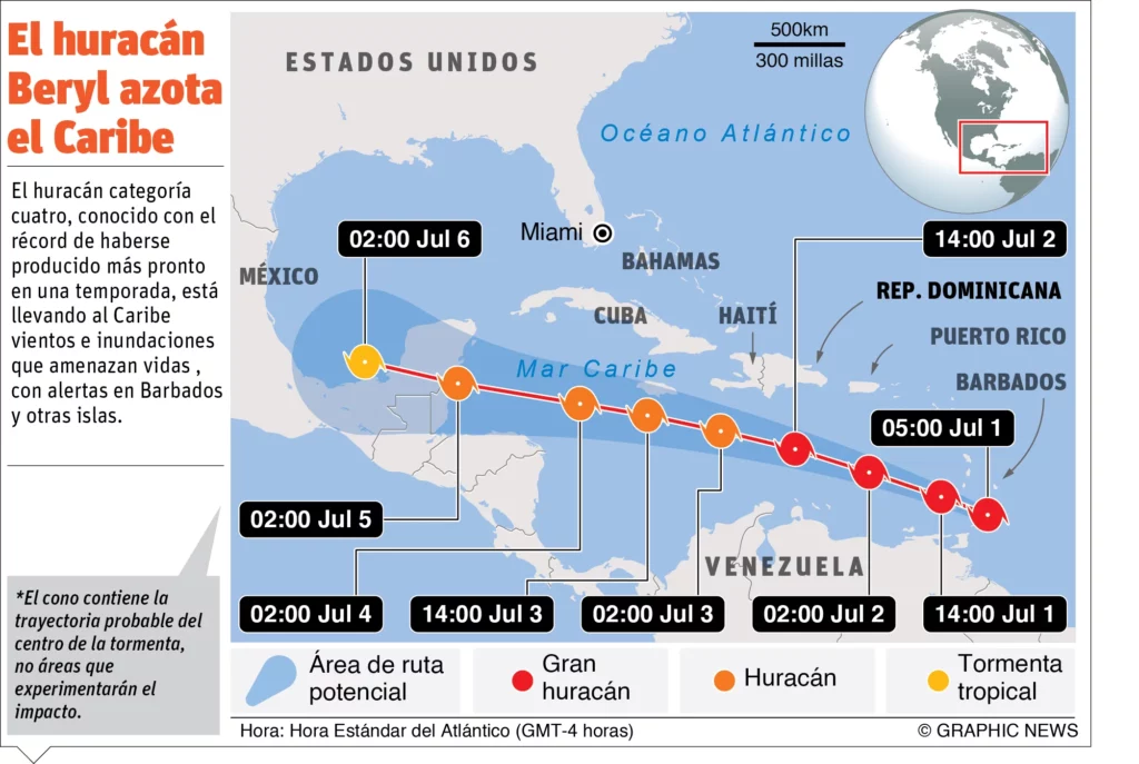 Santo Domingo .-Con pronóstico de lluvias y vientos intensos, así como marea de tempestad, se espera que desde la mañana de hoy se empiecen a sentir los efectos del huracán Beryl, categoría 4, sobre algunas zonas del territorio.