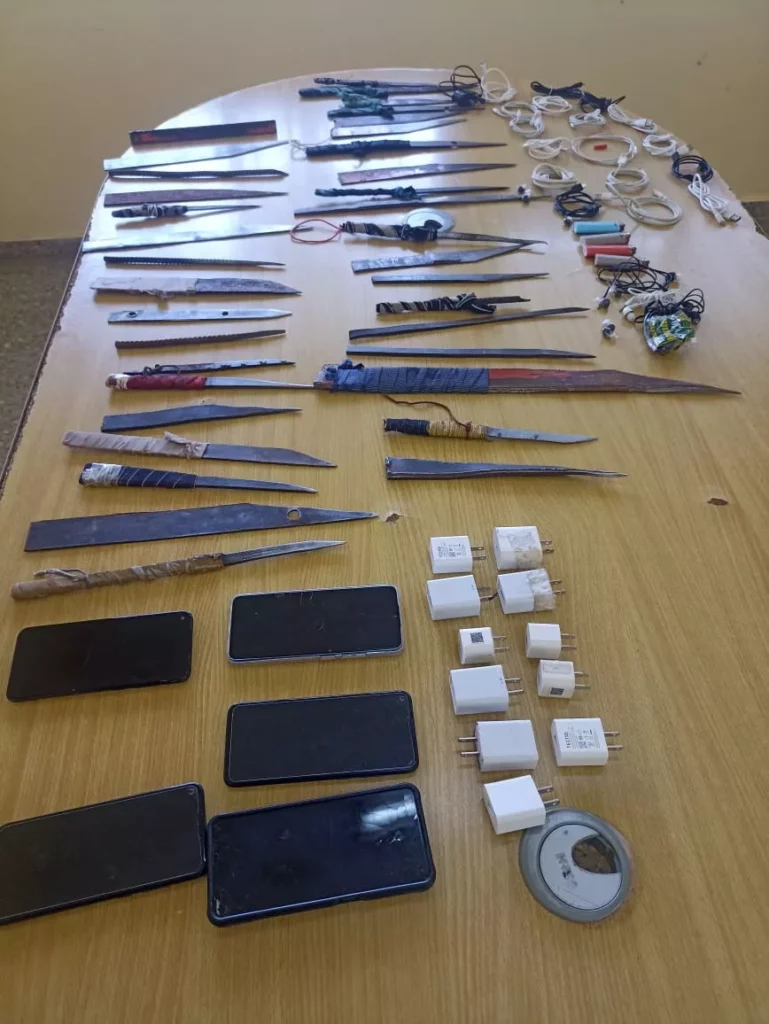 LA VEGA.- 36 objetos cortopunzantes, cinco teléfonos celulares, 17 cables USB, una fundita de tabaco y ocho porciones pequeñas, 11 cabeza USB, tres encendedores y tres auriculares con cable fueron encontrados durante un operativo en el Centro de Corrección y Rehabilitación El Pinito, de La Vega.