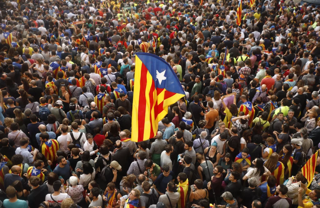 Un video tomado con teléfono celular en Girona, al noreste de Barcelona, y publicado en Twitter muestra una multitud que entona, "¡fuera, fuera, fuera la bandera española!" poco después de que el parlamento regional votara la independencia.