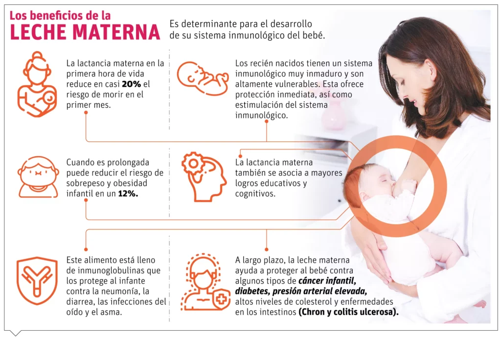En el bebé asegura un adecuado soporte nutricional y un mejor crecimiento y neurodesarrollo, mayor vínculo afectivo con su madre, mejor absorción, menor riesgo de enfermedades, menores visitas médicas, mayor desarrollo intelectual. Esta contiene anticuerpos como IGG e IGA (inmunoglobulina G y A) que protegen y ayudan a la maduración inmunológica; mejora el desarrollo de una adecuada microbiota intestinal, que previene infecciones de tipo gastrointestinales.