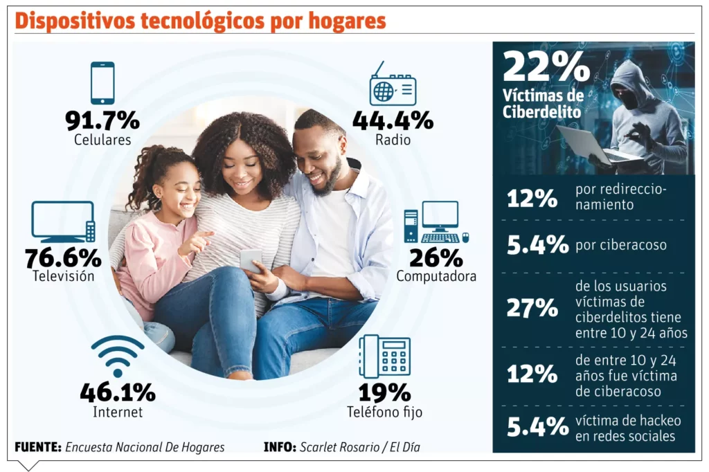 De acuerdo con datos de la encuesta Enhogar, el teléfono celular y el televisor son los dispositivos de mayor uso en los hogares dominicanos con un 91.7 % y un 76.6 % respectivamente, mientras que el internet alcanza al 46.1% de hogares y una proporción de 89 % de personas que lo utilizan, y en cuanto a teléfonos inteligentes, las mujeres son las que mayor acceso tienen, con el 82.4 % y los hombres con el 79.9 %.