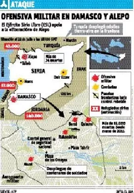 Los rebeldes controlan Bukamal, un puesto fronterizo con Irak, y tres con Turquía. En ese contexto, el ejército turco reforzó su dispositivo militar en la frontera con Siria con el envío de baterías de misiles tierra-aire y vehículos de transporte de tropas a Mardin (sudeste).