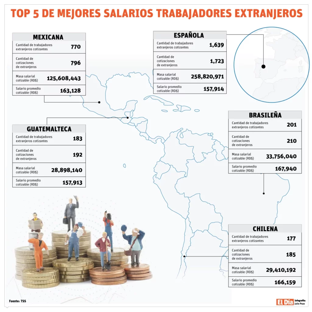 En tercer lugar se ubican los mexicanos, cuyo salario promedio asciende a RD$163,128, con una representación de 770 trabajadores. También figuran entre los mejor pagados los guatemaltecos, con un promedio de RD$157,913 y 183 cotizantes, y los hondureños, con RD$152,139 mensuales en promedio y 147 trabajadores.