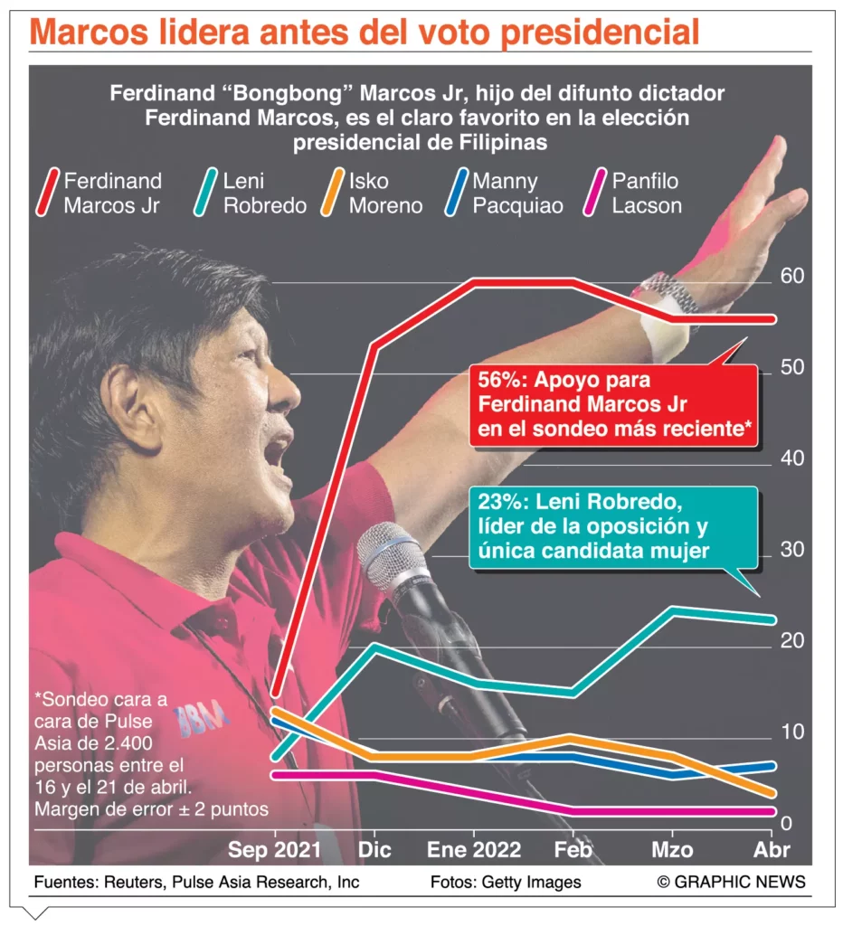 Filipinas vota hoy para elegir al sustituto del actual presidente, Rodrigo Duterte, tras sus seis años de mandato único, y “Bongbong” Marcos llega a los comicios con un gran margen, lo que apunta a que se convertirá, si no hay sorpresas, en el próximo jefe de Estado de Filipinas.