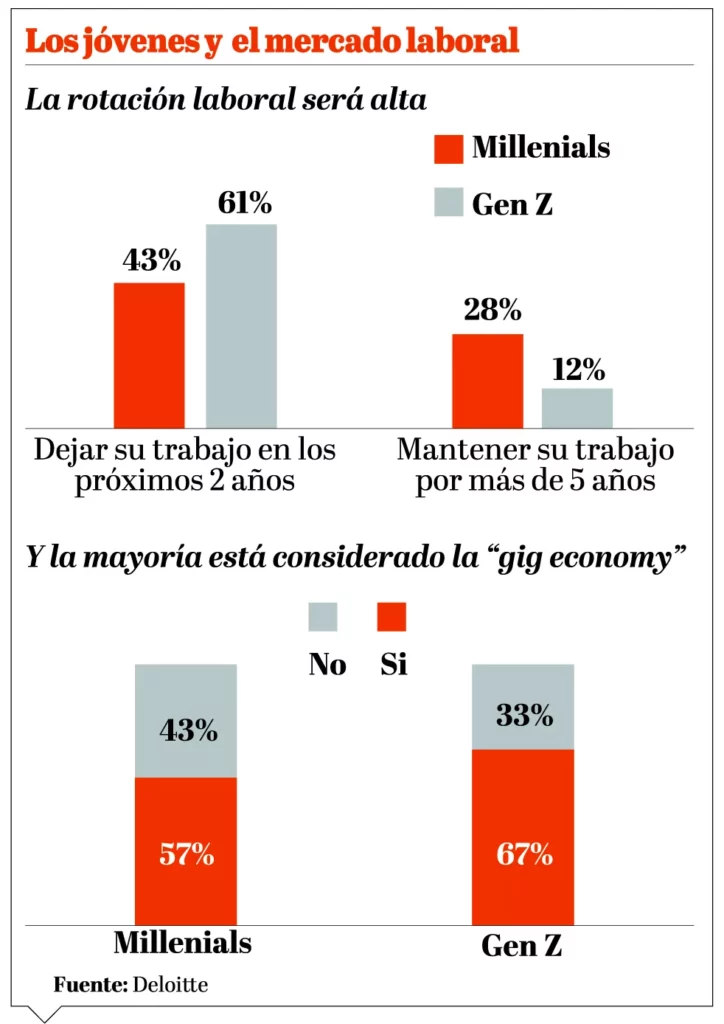 Menos de un tercio se visualiza con su mismo trabajo en los próximos 5 años, agrega el reporte que muestra cómo están pensando los jóvenes con respecto a su trabajo, empleadores y sus motivaciones.