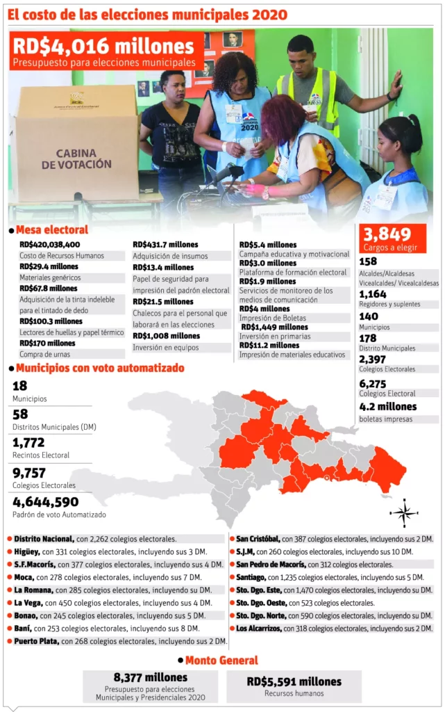 SANTO DOMINGO.-El Estado dominicano gastó más de cuatro mil millones de pesos en el montaje de las elecciones municipales que se iniciaron con las primarias simultáneas del seis de octubre en el año 2019, en la que los Partidos de la Liberación Dominicana y Revolucionario Moderno eligieron a sus candidatos.