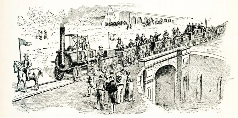 Ese día, cientos de pasajeros se apiñaron en alguno de los 20 vagones, mientras el tren a vapor alcanzaba los 40 kilómetros por hora con dirección a la cercana ciudad de Stockton. Este breve e histórico viaje marcó el primer tren público de pasajeros y el inicio del ferrocarril moderno.