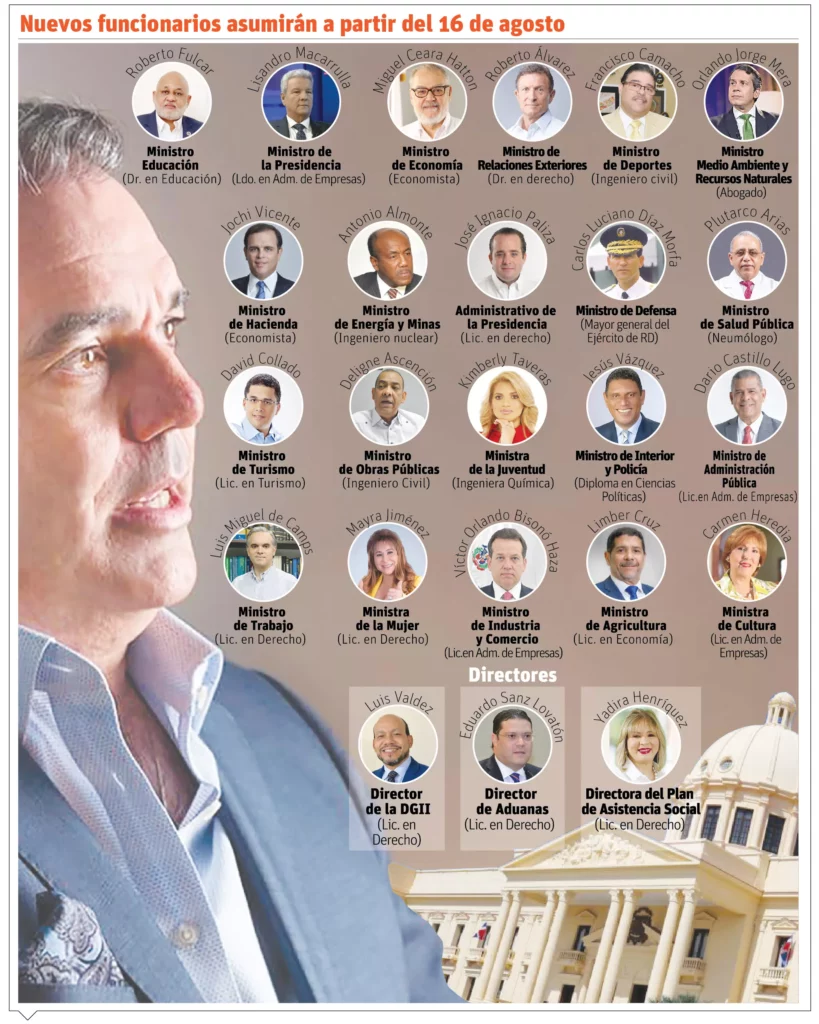 Mientras, el hasta ahora senador por Puerto Plata y presidente del Partido Revolucionario Moderno (PRM), José Ignacio Paliza, fungirá como ministro Administrativo de la Presidencia.
