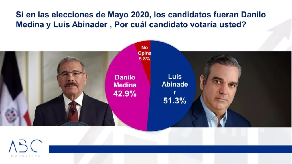 A la pregunta ¿Si en las elecciones de mayo del 2020, los candidatos fueran Danilo Medina y Luis Abinader por cuál candidato votaría usted? Un 51.3% dijo que por Abinader y un 42.9% por Medina, en tanto el 5.8% dijo estar indeciso.