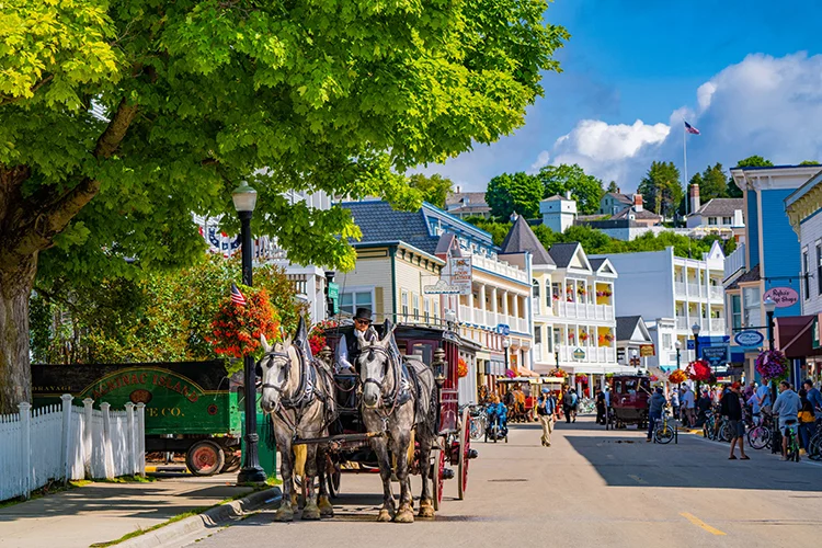 Más de un siglo después, unos 600 caballos hacen que todo funcione, desde el invierno hasta el verano, cuando aproximadamente 1,2 millones de personas se embarcan en un transbordador de 20 minutos desde Mackinaw City o St Ignace, en la Alta Península de Michigan, y llegan al pequeño pueblo (también llamado Isla Mackinac), en el extremo sur de la isla.