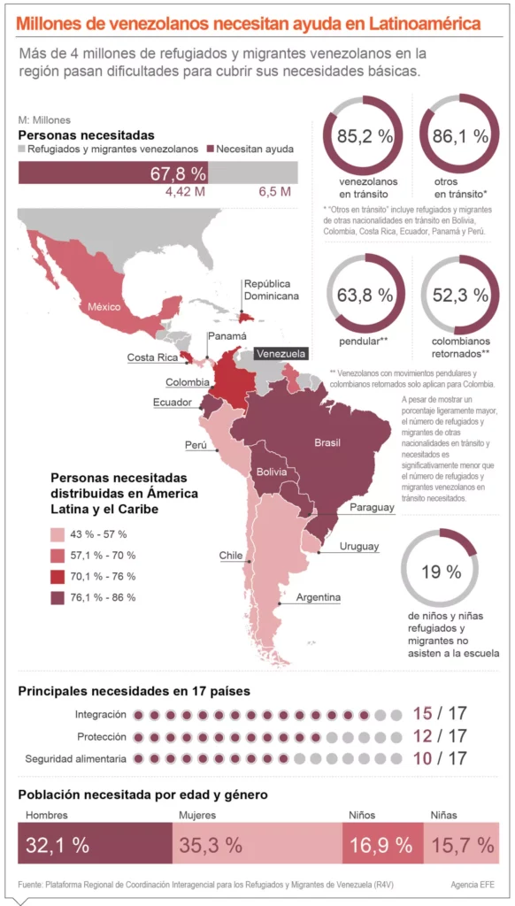 La Organización de las Naciones Unidas alertó de los 6,5 millones de refugiados y migrantes venezolanos acogidos en 17 países de América Latina y el Caribe, más de 4 millones tienen dificultades para cubrir las necesidades básicas de alimentación, servicios médicos, educación o vivienda.