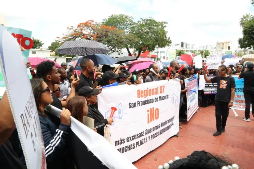 La manifestación, encabezada por el maestro Juan Valdez, partió desde la Plaza Simón Bolívar, en la avenida Máximo Gómez, hasta la sede del Ministerio de Educación (Minerd), donde exigieron ser designados en las plazas vacantes que, aseguran, existen en los diferentes distritos escolares del país.