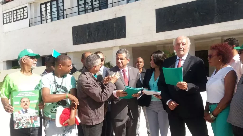 Carlos Pimentel, junto a otros representantes del colectivo entregaron a los diputados nacionales Fidelio Despradel y Fidel Santana y a la diputada Faride Raful un documento donde alegan las faltas cometidas por el mandatario, como recibir financiamiento ilegal para la pasada campaña electoral.