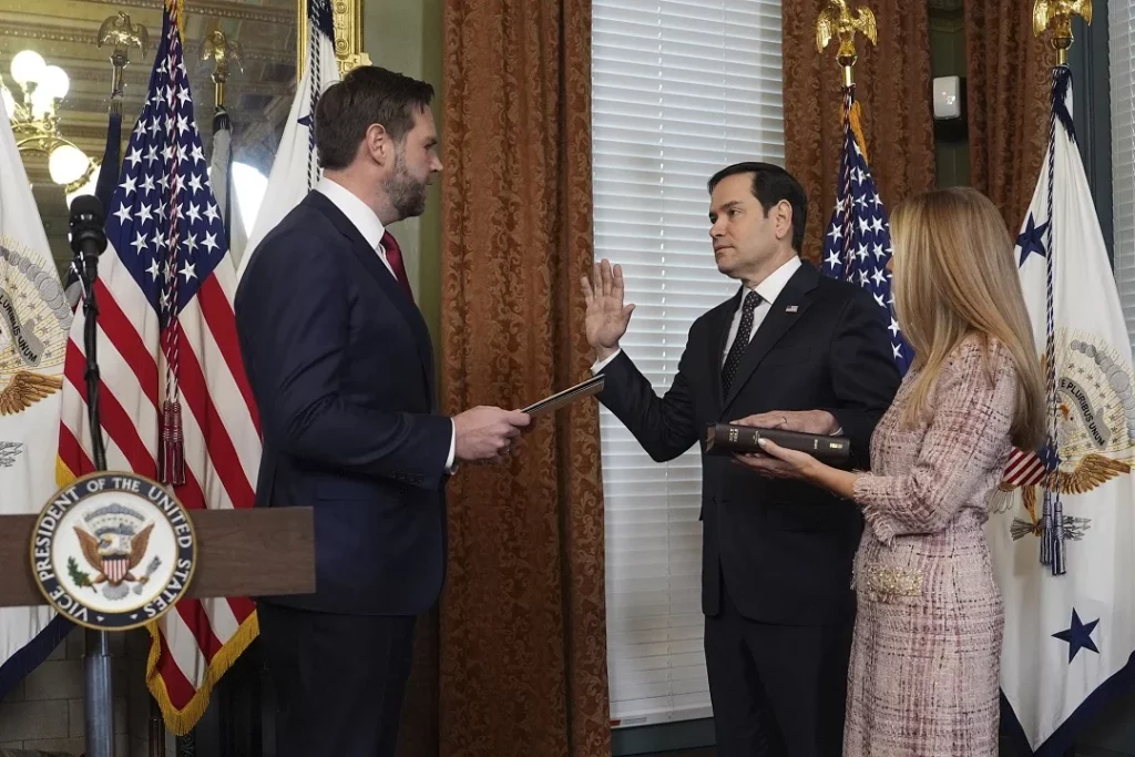 Rubio se convirtió el lunes en el primer confirmado del Gabinete de Trump tras recibir el apoyo unánime del Senado. El nuevo vicepresidente, JD Vance, fue el encargado de tomarle a Rubo el juramento.