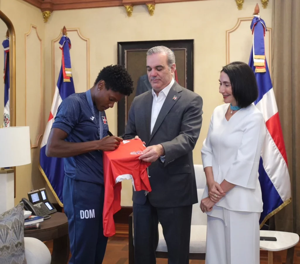 El presidente Luis Abinader recibió ayer a los medallistas olímpicos, Paulino, Yunior Alcántara y Cristian Pinales. El mandatario se hizo acompañar de la primera dama Raquel Arbaje y la vicepresidenta, Raquel Peña.