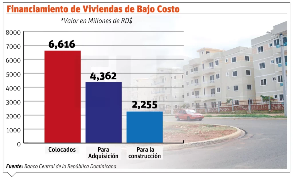 Con estas cifras, el monto promedio mensual desembolsado por las entidades de intermediación financiera, bajo este programa de financiamiento de viviendas de bajo costo, es de RD$1,300 millones por mes, con una distribución de 66 % para la adquisición de estas viviendas y un 34 % para su construcción.