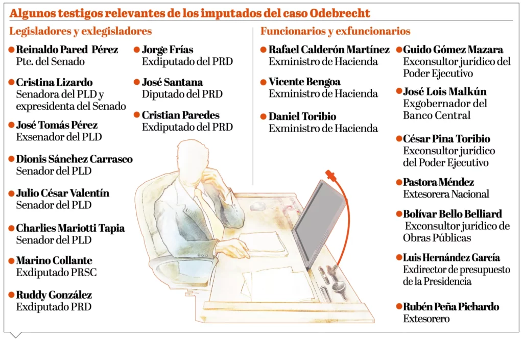 De los 22 aportados por el imputado Bautista están el presidente del Senado, Reinaldo Pared Pérez; la senadora Cristina Lizardo; el ministro de Agricultura, Osmar Benítez; la diputada Ginnete Bournigal, el exsenador César Díaz Filpo, el empresario Mario Antonio Alba Morillo y Boreli Alberty Grullón Castro. Mientras que Díaz Rúa ofertó como testigos a Diego Hugo de Moya y Pedro Delgado Malagón.