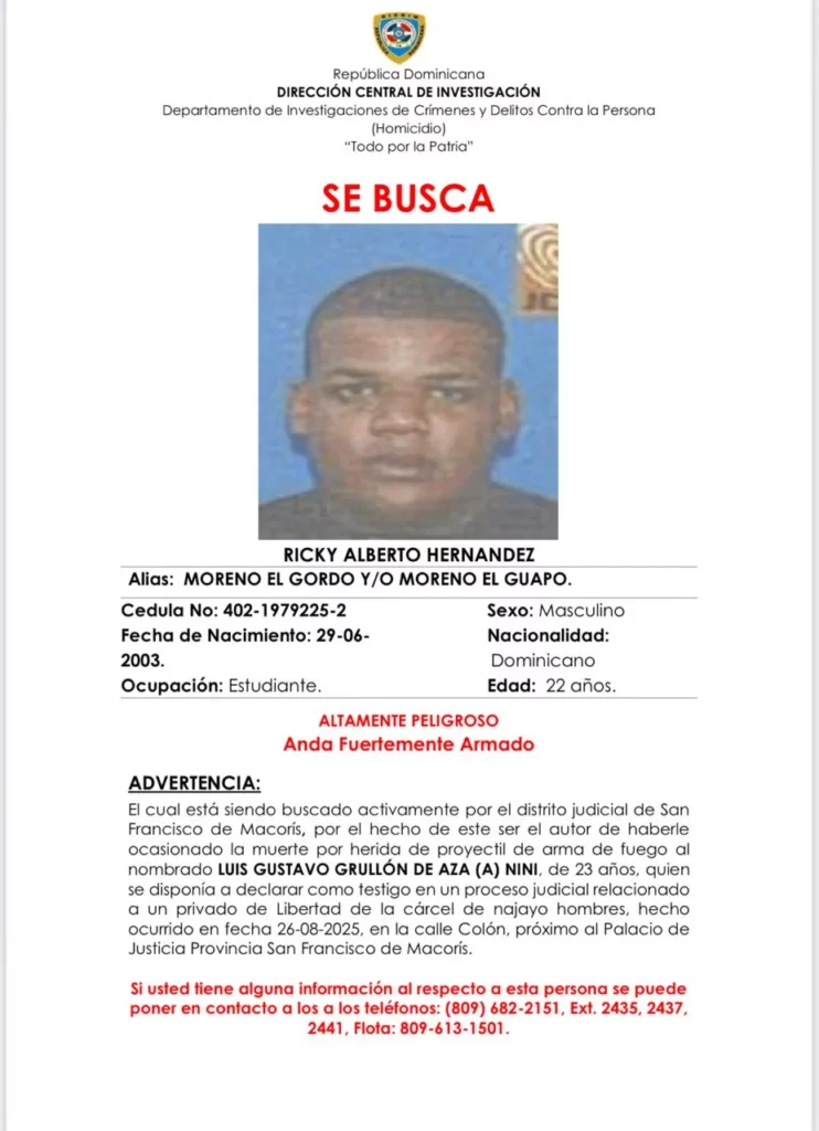 San Francisco de Macorís, Duarte. – La Policía Nacional identificó a Ricky Alberto Hernández, alias “Moreno El Gordo” y/o “Moreno El Guapo”, de 22 años, como el presunto autor del asesinato de Luis Gustavo Grullón de Aza, conocido como “Nini”, de 23 años, quien fue ultimado a tiros ayer en la calle Colón, a pocos metros del Palacio de Justicia local.