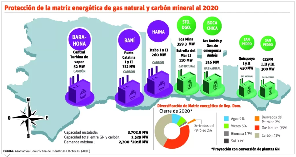SANTO DOMINGO.-La diversificación de la matriz energética reducirá casi a cero la dependencia del petróleo en ese sector, al aumentar a un 80% la cantidad de energía generada a base de gas natural y carbón mineral; sin embargo, esta nueva composición sigue atada a fuentes fósiles (no renovables).