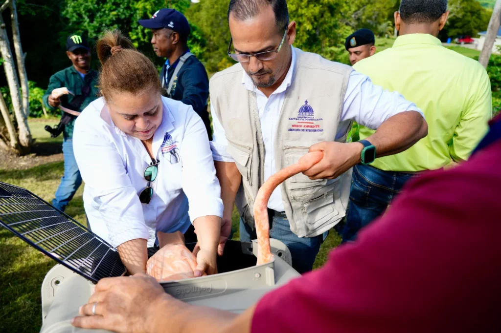 Los técnicos Luis Aníbal José Amparo e Indira Sanchez, inspectores del Departamento de Regulación y Control de Vida Silvestre de la Dirección de Biodiversidad, rescataron las aves en Flamingo Jungle, un espacio de alojamientos que se oferta a través de la plataforma Airbnb.