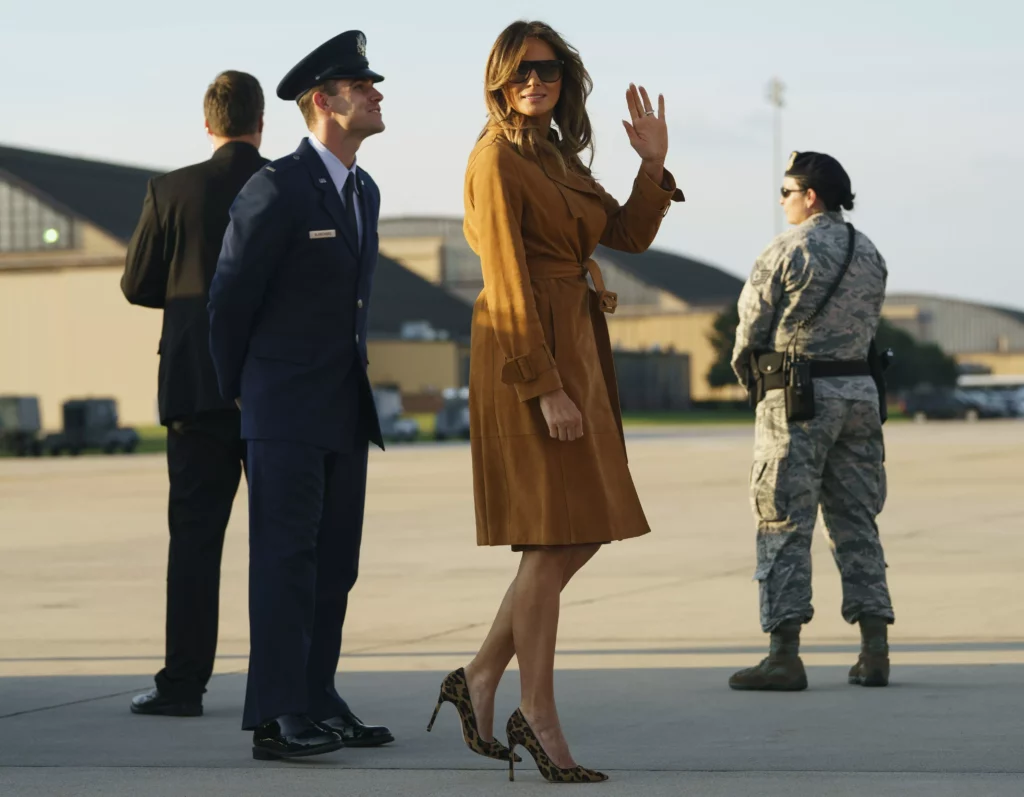 Melania Trump no hizo declaraciones a la prensa antes de embarcar en su avión, vestida con una gabardina de ante marrón y unos tacones de aguja con estampado de leopardo.