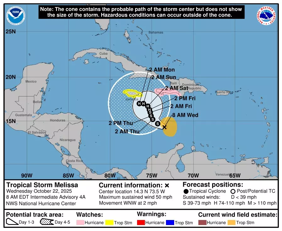 Melissa mantiene vientos máximos sostenidos de 85 km/h con ráfagas superiores, y los modelos de intensidad indican un fortalecimiento gradual, por lo que podría convertirse en huracán mañana jueves, de acuerdo con los pronósticos del organismo meteorológico.