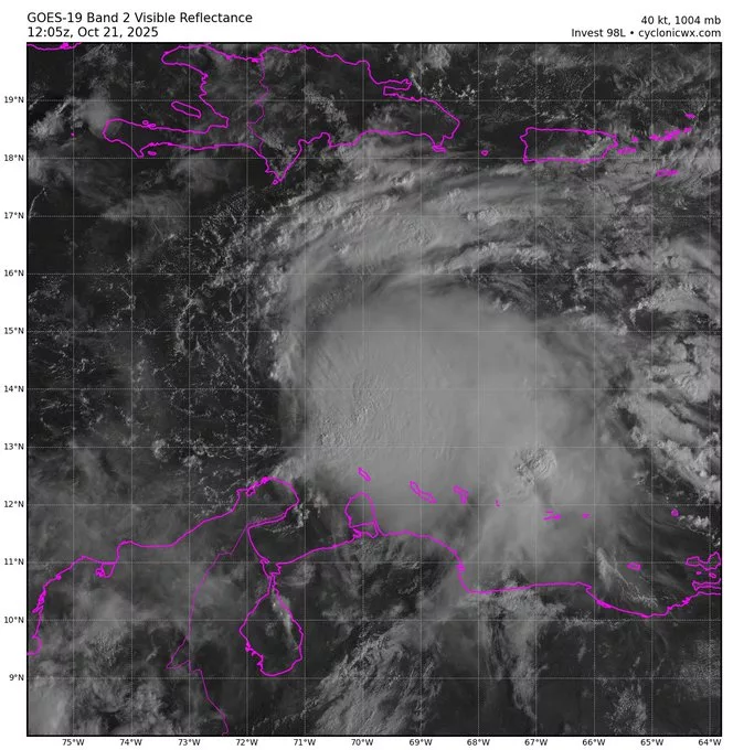 Según el organismo, el centro de la tormenta se encuentra ubicado en la latitud 14.0° N y longitud 70.8° O, con una presión central de 1002 mb y vientos sostenidos de 75 km/h.
